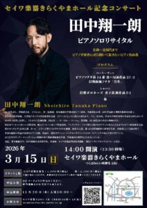 『セイワ楽器きらくやまホール記念コンサート 田中翔一朗ピアノソロリサイタル』開催のお知らせ